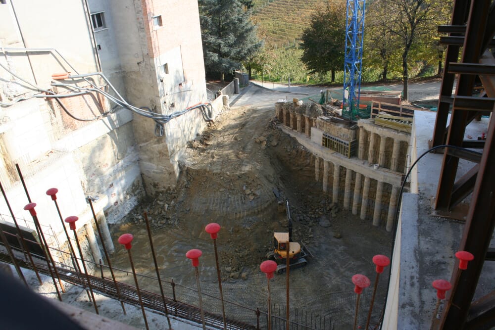 Il progetto ha previsto l'ampliamento della cantina esistente nel pieno centro di Barbaresco attraverso la demolizione di alcuni volumi fuori terra e la realizzazione di nuovi volumi sia interrati che non. La struttura presenta 5 livelli interrati e 2 fuori terra. La struttura è in cemento armato ordinario gettato in opera con solai a piastra collaborante; per contenere le deformazioni orizzontali sia in corso d'opera che nelle fasi successive sono state realizzate strutture di contenimento a palificate. Lo scavo si estende fino a quota -19,75 m dal piano di riferimento a monte (piazzale esistente). In fase di progettazione la criticità era rappresentata anche dalla presenza di edifici con apparato fondale a quote superficiali e differenti rispetto al nuovo fabbricato. Le modalità esecutive del progetto si sono rivelate per cui essenziali e determinanti per una corretta e sicura esecuzione dell'intervento.